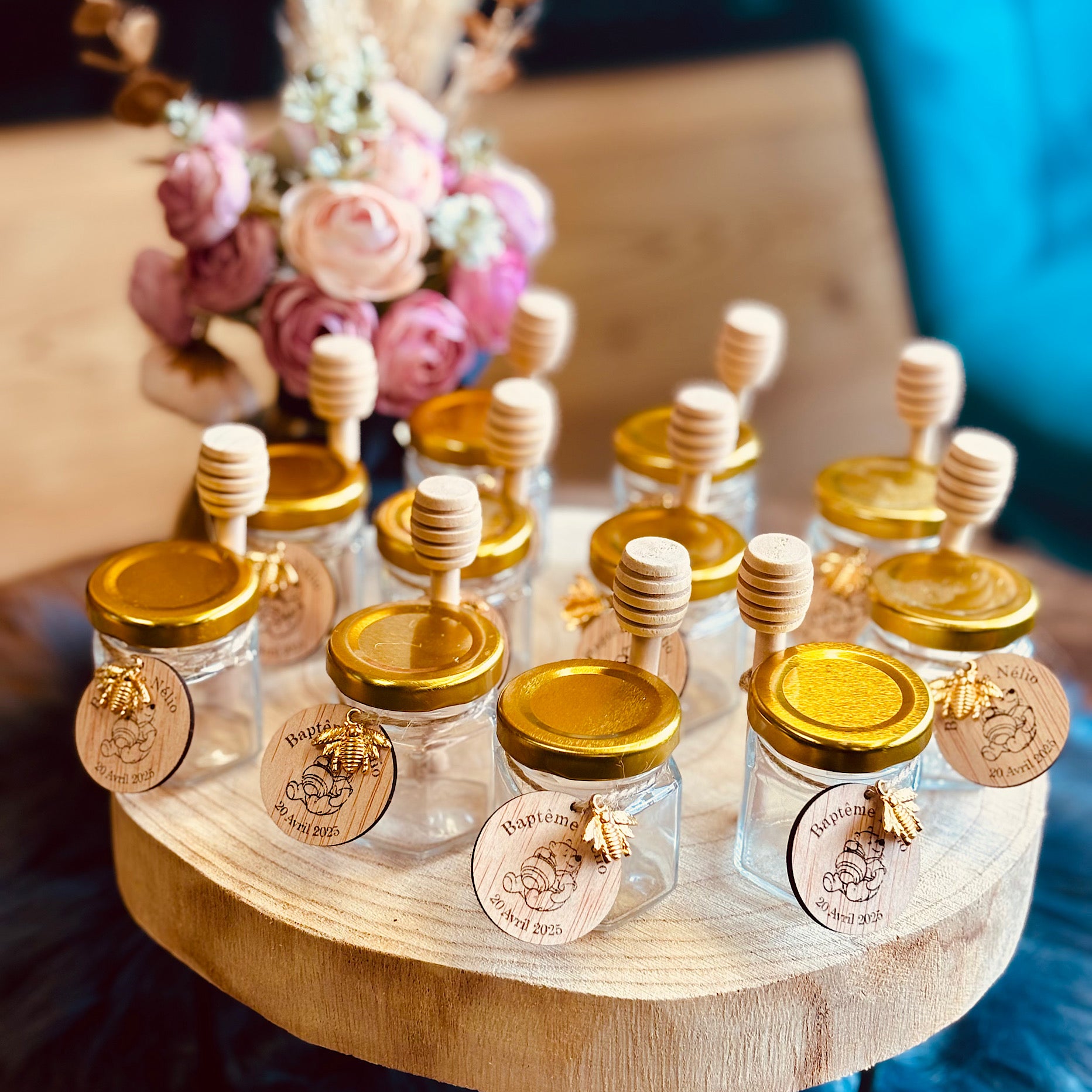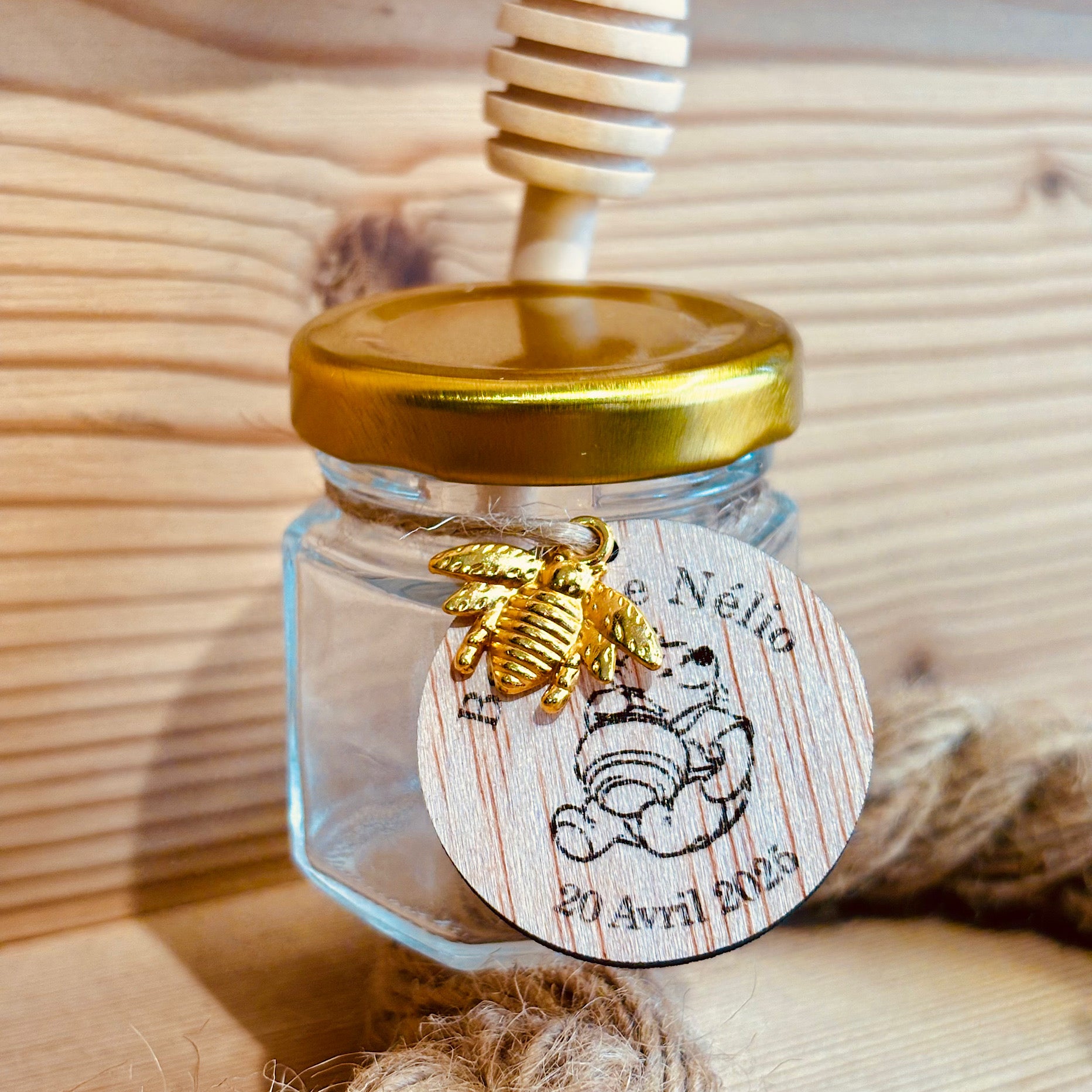 Offrez un Pot de Miel unique, personnalisé avec un rond en bois naturel gravé selon le thème de votre choix. Ce cadeau délicat allie douceur et authenticité, parfait pour célébrer un moment spécial ou embellir votre table avec une touche personnelle et chaleureuse.